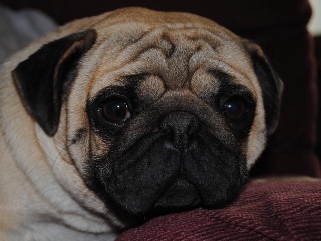 His personality is warm and very friendly. He is intensely loyal and very protective of his people. His antics are clownish and frequent; he is constantly "protecting" us from the other Pugs