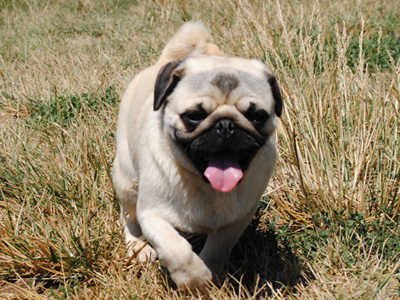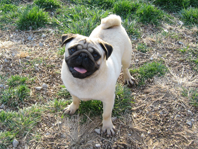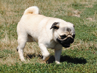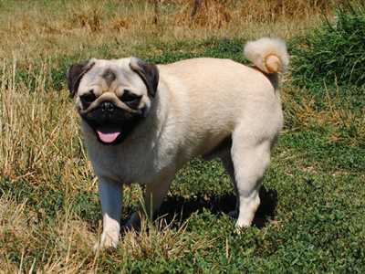 He has some unique talents not normally seen in Pug behavior. He has incredibly good balance and can stand on his two rear feet with his paws in the air for extended periods of time. He loves the attention that he receives when he performs this trick, so as you would expect he is constantly doing it!